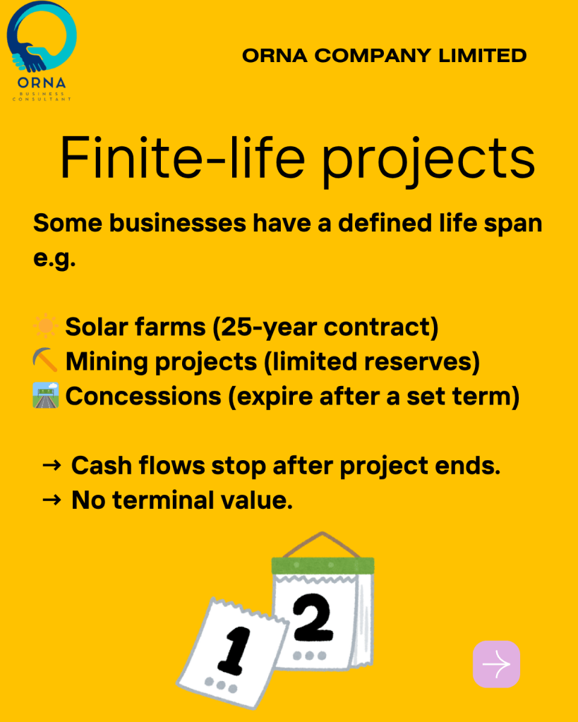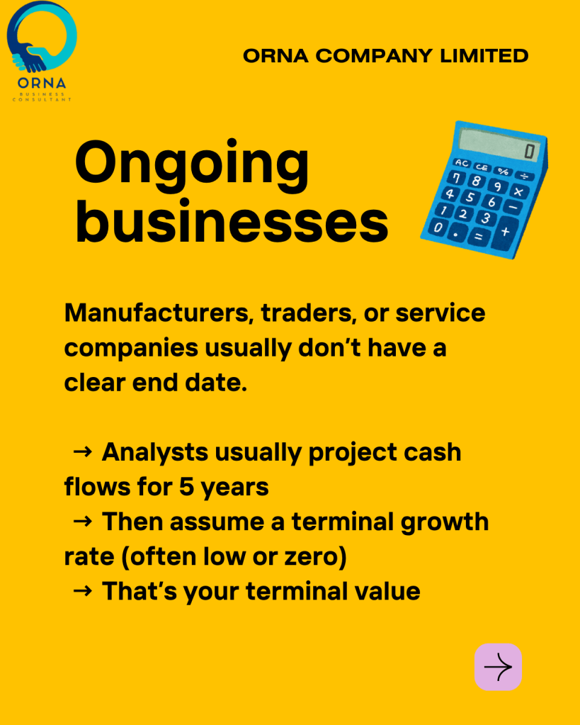 For companies that can be assumed to continue operating indefinitely — like manufacturers, trading firms, or service businesses — analysts usually project cash flows for 5 years, then assume a terminal growth rate (sometimes even zero to be conservative).