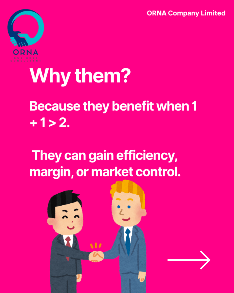 Basically, someone who would benefit when the two businesses combine — when 1 + 1 > 2.