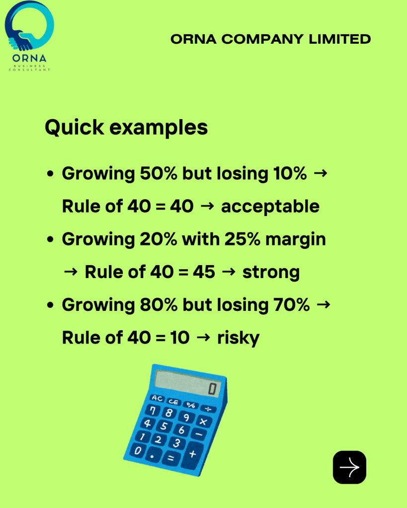- Growing 50% but losing 10% → still okay (Rule of 40 = 40).