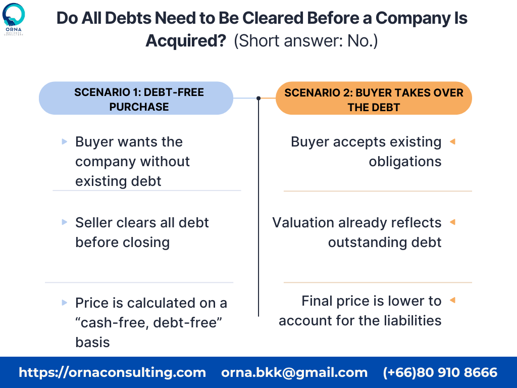 Both scenarios are normal in M&A—what matters is that the agreement clearly states how debt will be handled before closing.
