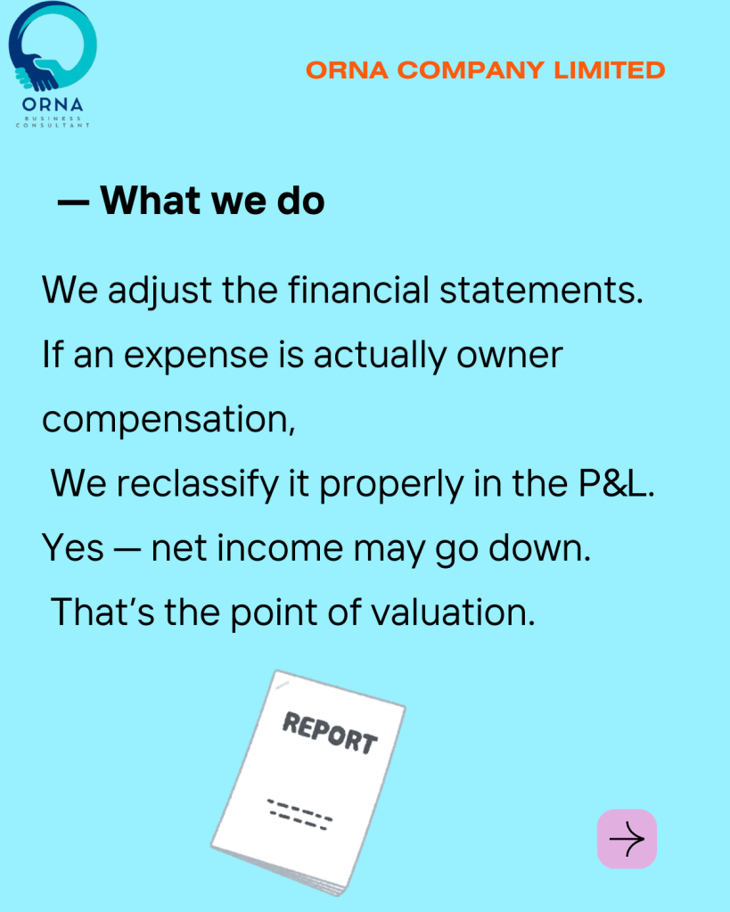 If an expense was recorded as a selling expense but is actually owner compensation, we reclassify it properly in the P&L.